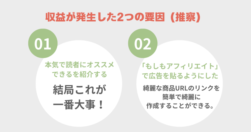 実際、「もしもアフィリエイト」でリンクを貼り付けてから初めて収益が発生したので、本当にオススメできるサービスだと思っています。