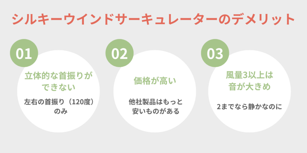 サーキュレーターによっては立体的な首振り(上下左右)ができる製品もありますが、シルキーウインドサーキュレーターは左右の首振り(120度)のみなのが残念です。