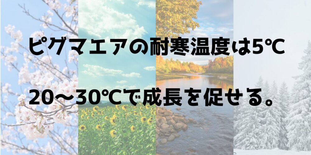 ピグマエアは夏季と厳冬期が苦手なため、春秋の気温を意識して管理してあげることで、通年で成長を促すことができます。具体的には、20℃〜30℃で管理すると成長を促しやすいです。