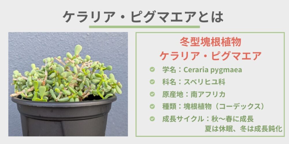 小さくてつぶつぶの葉っぱが特徴の冬型塊根植物、ケラリア・ピグマエアはみんなが大好きな株だと思います。塊根植物の沼にはまると、多くの人がピグマエアの魅力に引き込まれると思います。