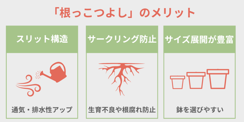 根っこつよしは鉢の側面に空気と光を通すスリットがあるので、通気性・排水性の向上、過湿を防ぐことで根腐れのリスクを軽減し、健康的な根の発達を促します。