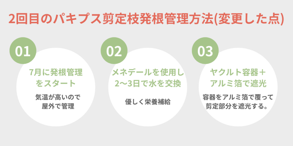 2回目のパキプス剪定枝発根管理方法(変更した点)