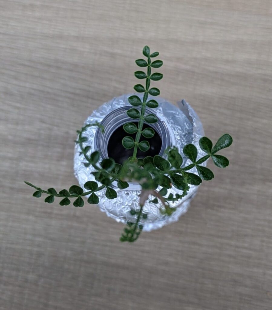 剪定した部分に光が当たらないよう、容器全体をアルミ箔で覆って遮光しています。