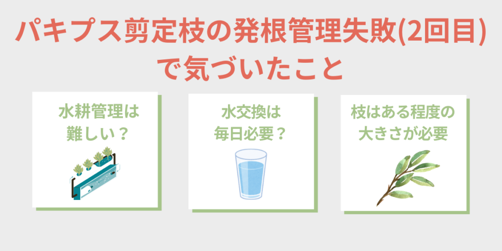 2回の失敗を経験して、パキプスの剪定枝を水耕管理で発根させるのは難しいのでは?と感じています。