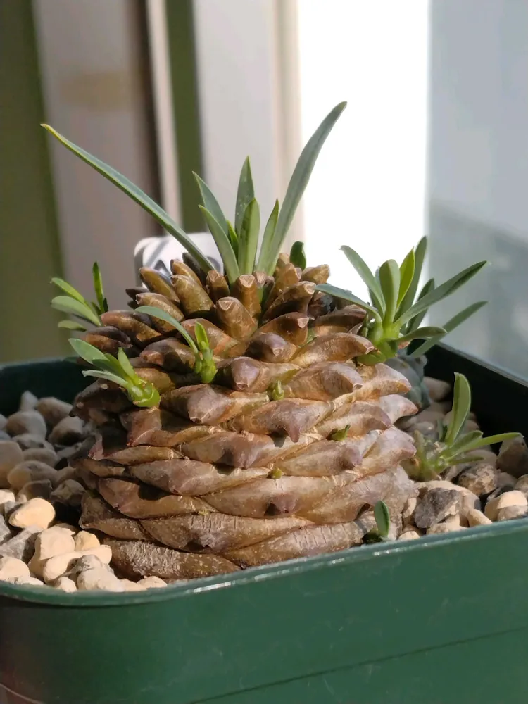 標高の高い乾燥した草原に自生し、松かさのような黒褐色の幹をしています。成長が遅く、最大でも20センチ程度。雌雄異株で、冬越しに必要な温度は約5℃です。