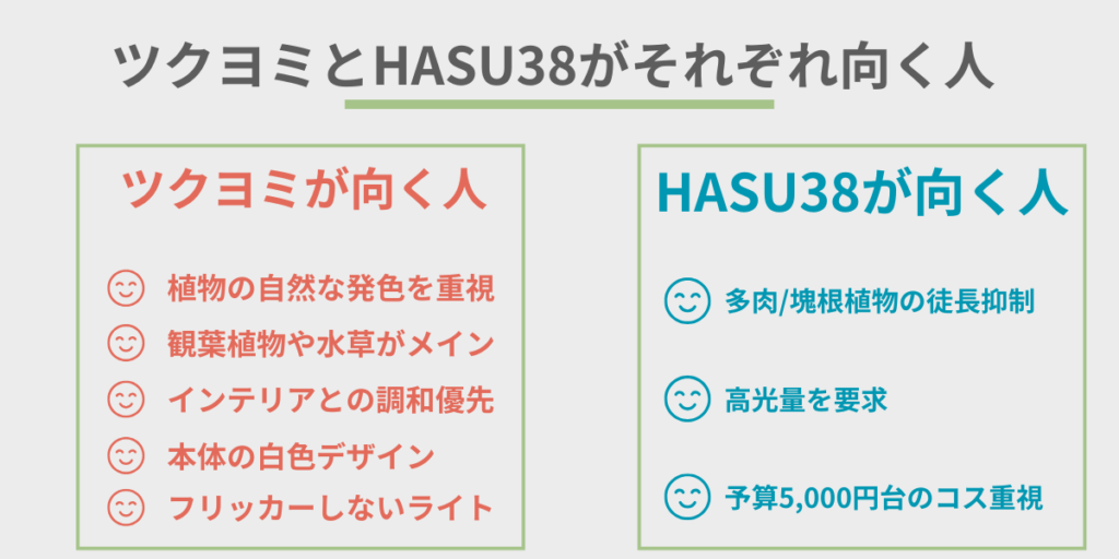 ツクヨミは太陽光とほぼ同等の色再現性を持ち、植物や水槽内の見た目を自然な状態で鮮明に照らします。HASU38は白色系(約6,100K)で人工的な光の印象が強く、演色性に関する明記はありません。