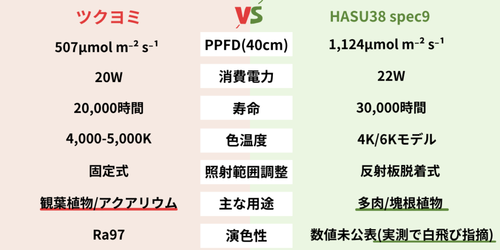 植物育成ライト「ツクヨミ」 vs 「HASU38 spec9」