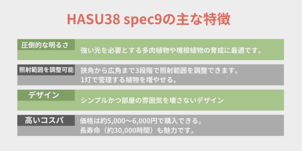 HASU38 spec9は、HaruDesignが販売する高性能な植物育成LEDライトで、アクアリウムや多肉植物、観葉植物の育成に幅広く利用されています。主な特徴は以下の通りです。