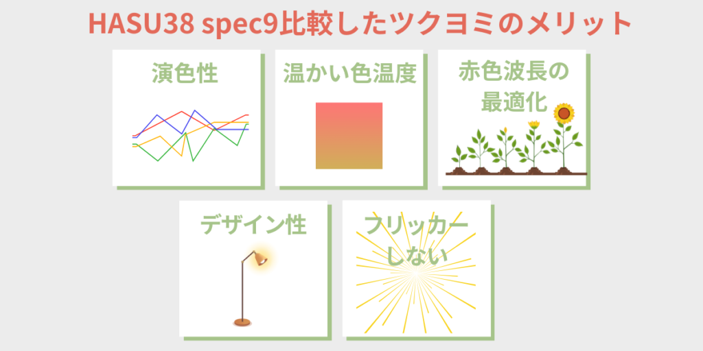 HASU38は白色系(約6,100K)で人工的な光の印象が強く、演色性に関する明記はありません。