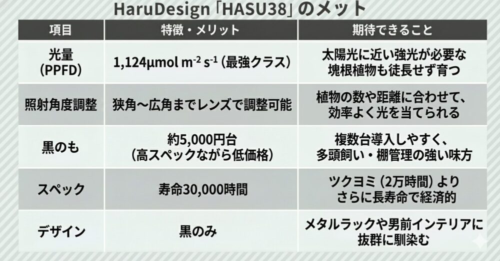 HASU38 spec9は、HaruDesignが販売する高性能な植物育成LEDライトで、アクアリウムや多肉植物、観葉植物の育成に幅広く利用されています。主な特徴は以下の通りです。