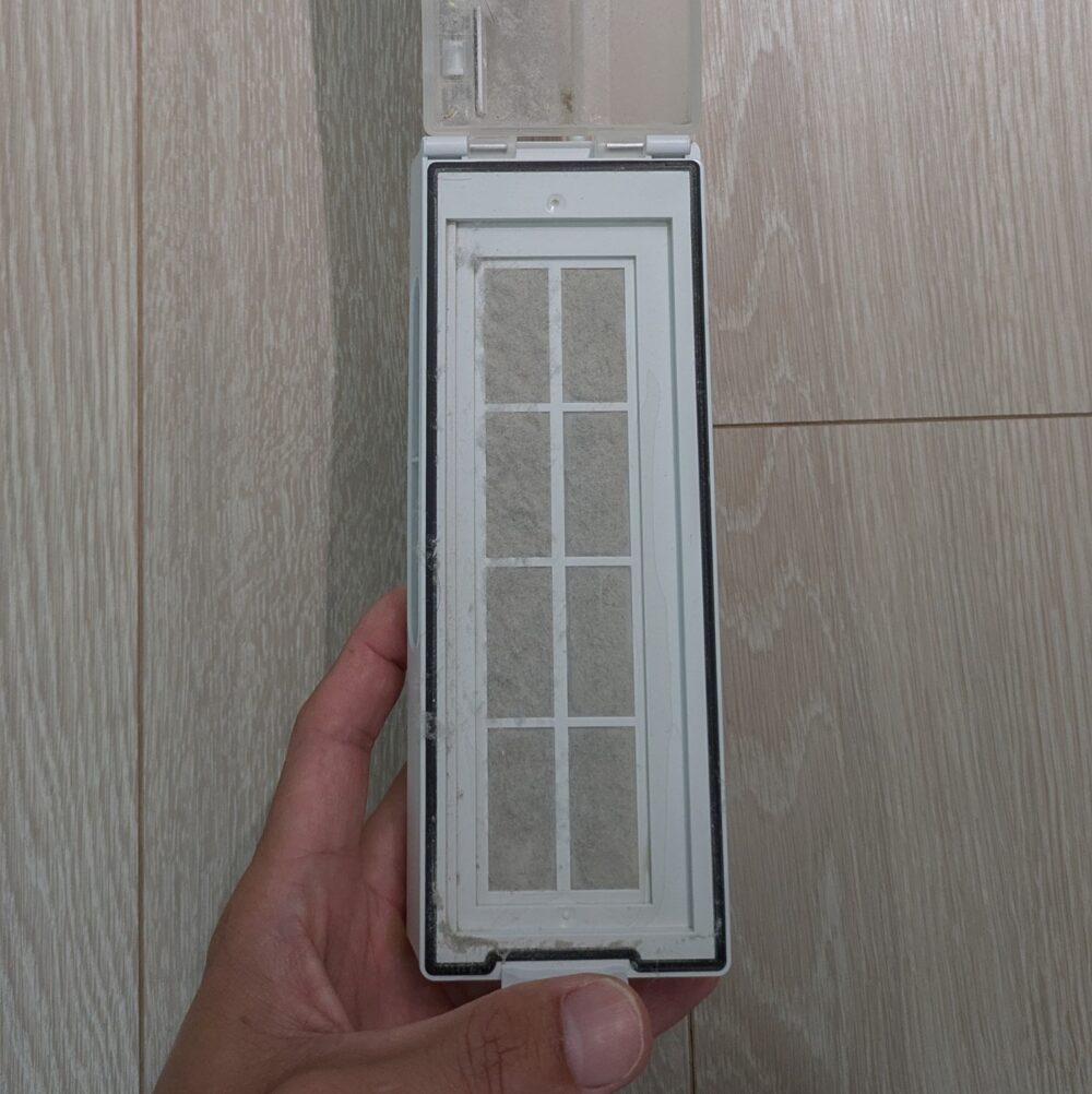 簡単です。本体のカバーを開いてゴミボックスを取り出します。ボックスを開いてフィルタを拭き取るだけ。