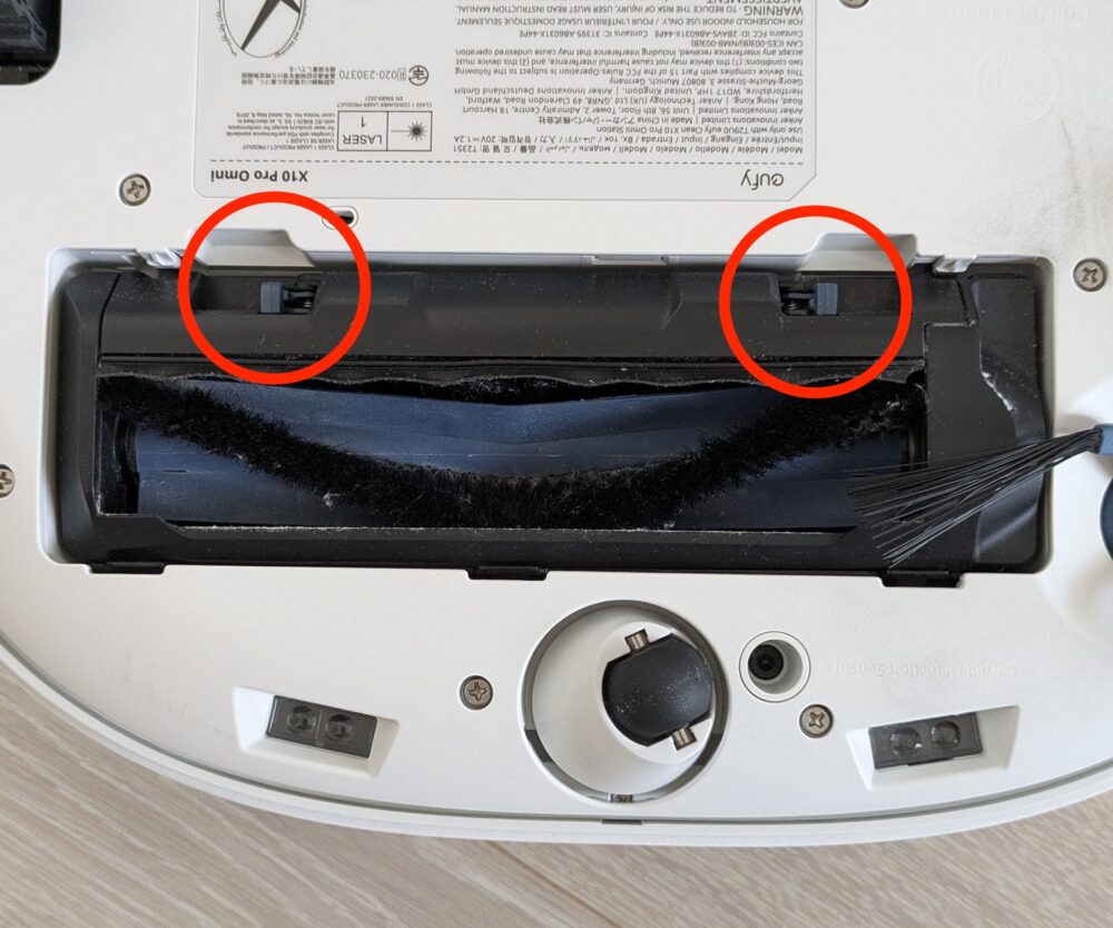 本体裏側のブラシ部分の赤丸のツメをつまんであげるとブラシを取り外すことができます。