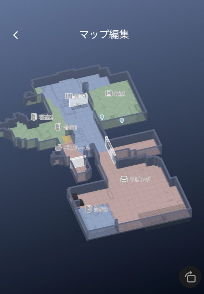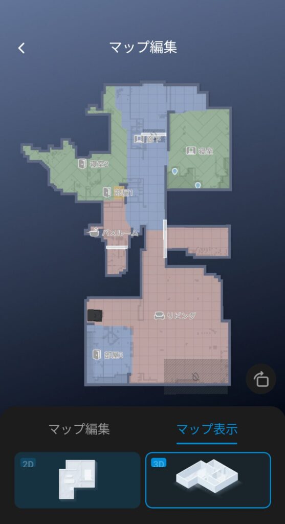 掃除をするたびに部屋の間取りを覚えて、より詳細な間取りが完成します。間取りが完成後は部屋ごとの掃除設定(吸引のみ、拭きのみ等)ができます。そして謎に2Dと3Dの表示を選ぶことができます(笑)