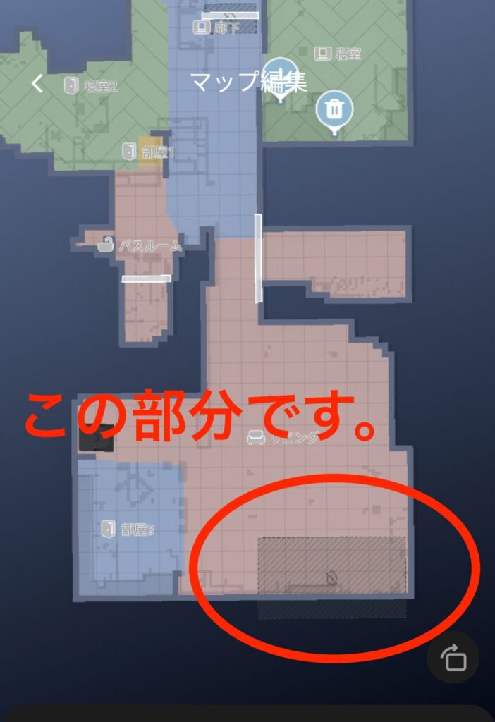 入ってほしくないところを詳しく設定できます。玄関の靴脱場に侵入してほしくないので侵入禁止設定できます。そして、部屋は水拭きありでも、フロアマットやラグを引いている場所は水拭きなし(上図の赤丸部分)など部屋の中の細かな設定も簡単にできます。