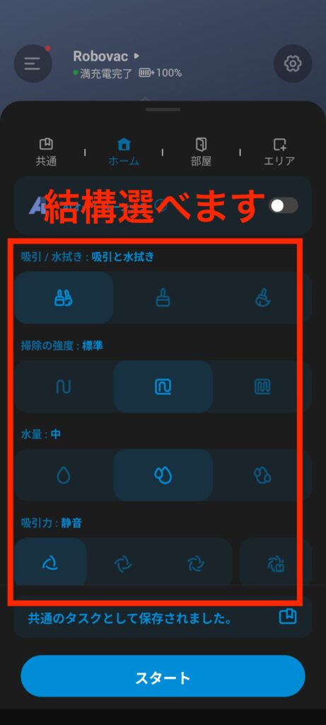 掃除の強度を3段階から選ぶことができます。長く家をあけるなら「しっかり」を設定することもできる。あくまでも自分で掃除機をかけたいなら、「標準」や「すばやく」を設定することもできます。吸引力も静音、標準、ターボ、最大から選ぶことができます。