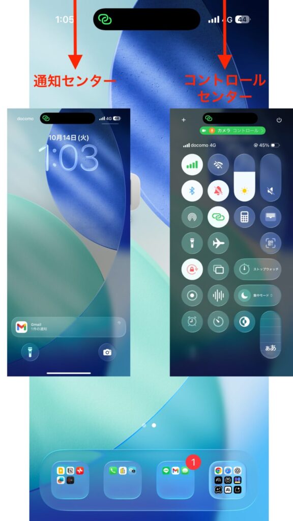 iPhoneは、画面右上部がコントロールセンター、左上部が通知センターと別々の仕様になっています。なぜ分かれてるのか謎です(笑)